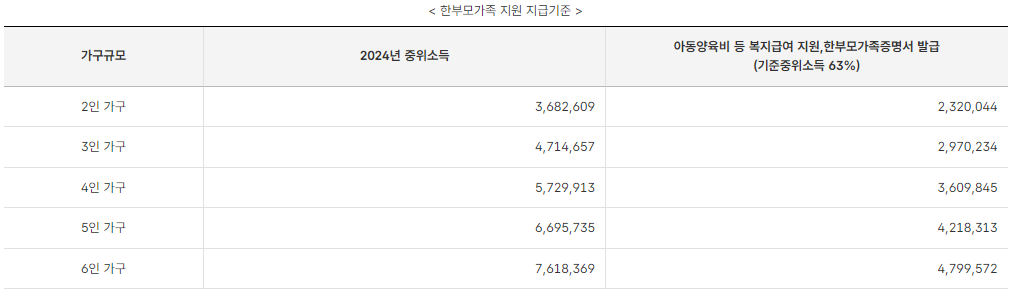 2024년부터 한부모가정 지원혜택의 문턱이 낮아졌습니다. 이전에는 기준중위소득 60% 이하 가정만 지원을 받을 수 있었는데요. 이제는 기준중위소득 63% 이하 가정까지 지원 대상이 확대되었습니다. 쉽게 말해, 2인 가구 기준으로 월 소득이 약 232만 원 이하, 3인 가구 기준으로 약 297만 원 이하라면 지원을 받을 수 있게 된 거죠.