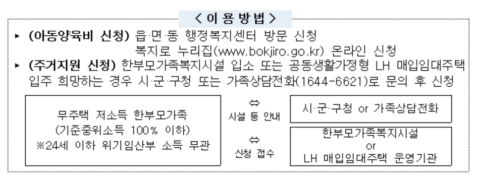 - 한부모가정 지원혜택의 소득 기준이 기준중위소득 63% 이하로 확대되었습니다.