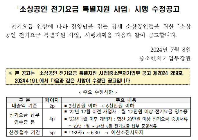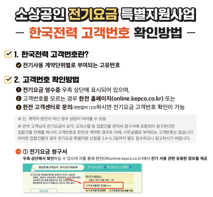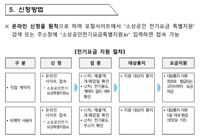| 문의처 | 소상공인전기요금특별지원 콜센터 ☎ 1533-0200 (평일 09 ~18시) 한국전력 콜센터 ☎ 123 (연중무휴) |