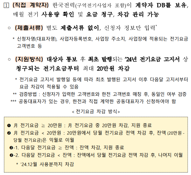 📝 지원 방식: 대상자 통보 후 최초 발행되는 2024년 전기요금 고지서 상 청구되는 전기요금부터 최대 20만원 차감.