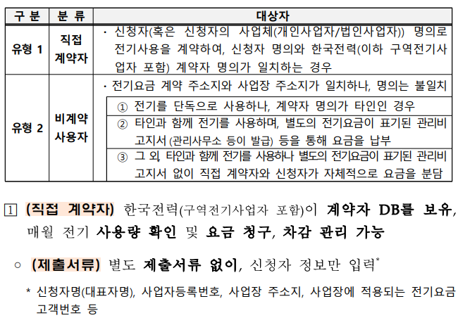 📝 직접계약자: 한국전력과 본인명의 계약을 맺고 있는 소상공인. 이들은 전기요금을 직접 납부하며, 계약자 명의와 사업자 명의가 일치해야 합니다. 이러한 경우는 소상공인 전기요금 감면 지원 대상에 포함됩니다.