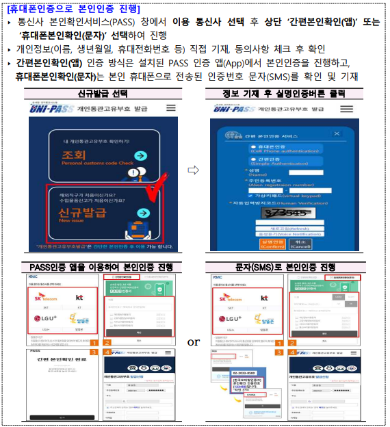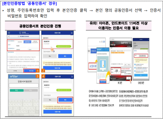 | 본인인증 방법 | PASS 앱, 문자 인증 등 | 휴대폰 인증, 공동인증서 인증, 간편인증 등 |