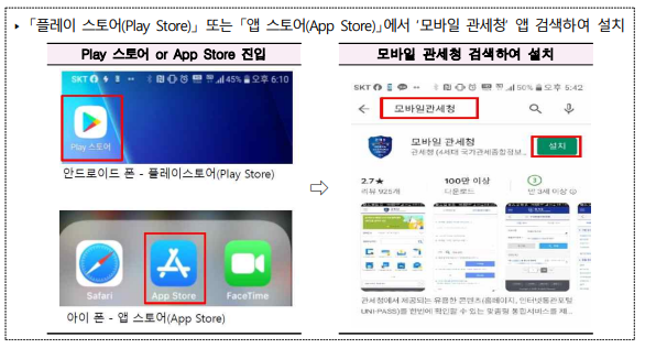 - 모바일 관세청 앱 설치: 플레이스토어나 앱스토어에서 '모바일 관세청' 앱을 검색하여 설치합니다.